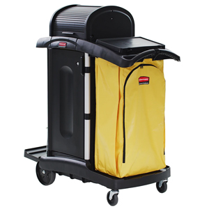 Rubbermaid Executive High Security Janitor Cart the ultimate in secure housekeeping carts with lockable security hood and and cabinet locking doors. Keeps the cleaning products concealed from view and locked up when cart is unattended. Commonly used in Healthcare Facilities Hotels, Resorts, Offices, Retail.