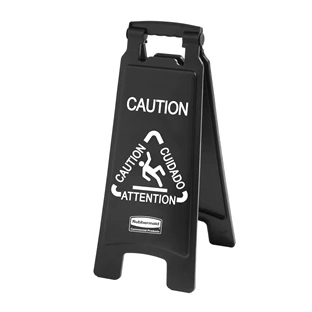- “Caution Wet Floor” White Imprinted message in English, French and Spanish on Black A-Frame Sign