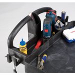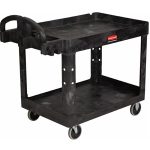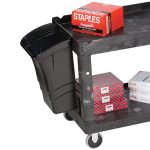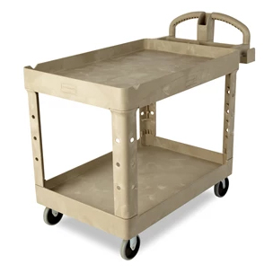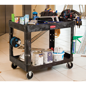 Medium Sized Utility Cart with Lipped Shelf is a Heavy Duty 2 Tiered Trolley with Lips-up shelves to hold content securely on tray and moulded-in storage compartments, holsters, hooks, and notches to increase organisation and efficiency and versatility.