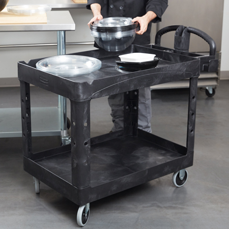 Medium Sized Utility Cart with Lipped Shelf is a Heavy Duty 2 Tiered Trolley with Lips-up shelves to hold content securely on tray and moulded-in storage compartments, holsters, hooks, and notches to increase organisation and efficiency and versatility.