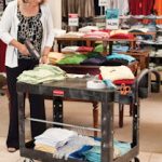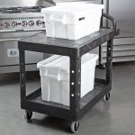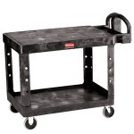 Rubbermaid Commercial Heavy Duty 2-Shelf Utility Cart with Ergonomic push handle has a flat top shelf that can be used as a work surface. Ideal for tradespeople on maintenance jobs.