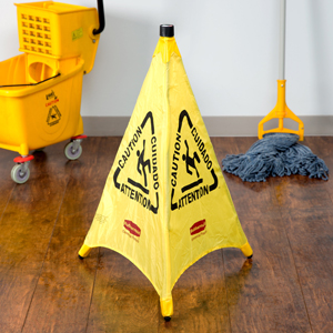 Pop-Up Safety Cone Three-sided for visibility from multiple directions. Multi-Lingual Caution Imprint and Wet Floor Symbol.