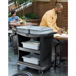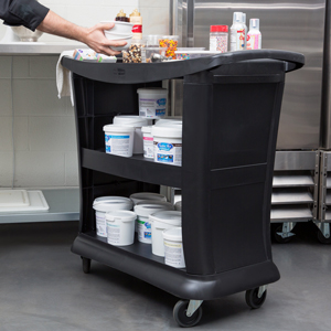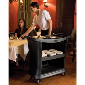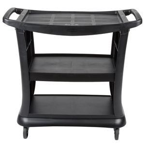 The Rubbermaid 9T68 Executive Service Cart is stylish and functional, making it suitable for various environments such as hotels, offices, schools, universities, hospitals, nursing homes, and more.Â