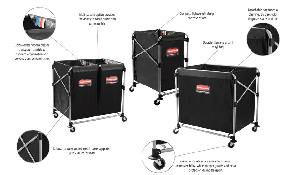 Rubbermaid Executive Series 150 Litre X-Carts is a small cleaning cart for transporting soiled linens or garbage in Hotels, Resorts, Hospitals, Fitness Centres, Commercial Kitchens etc.