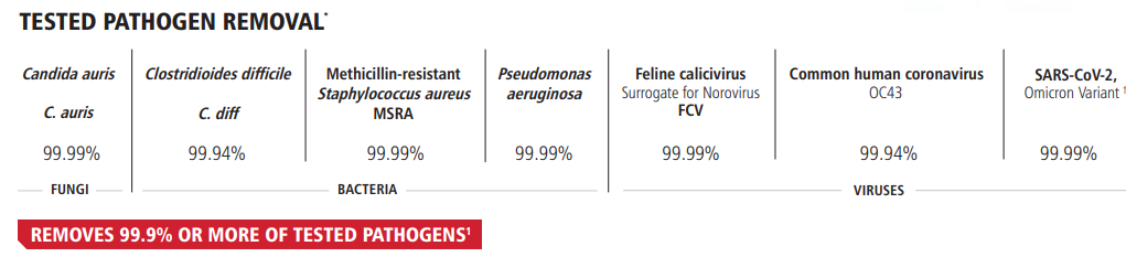 - Proved to remove 99.9% of tested viruses and bacteria with water only*Â