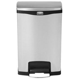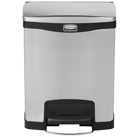 Top of the Range, Rubbermaid, IMPRESSIONS Front Step On, Stainless Steel Refuse Container. The aesthetically pleasing design suits all areas—Fingerprint Resistant Stainless Steel with Black Resin Trim.