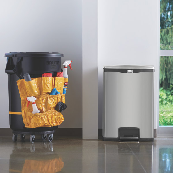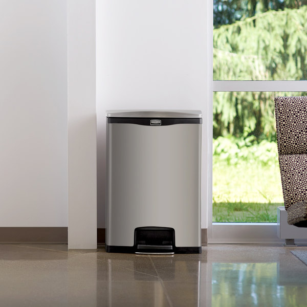 The Rubbermaid 1901999 Slim Jim 90 Litre Stainless-Steel front step-on Bin with black accents offers a convenient and sanitary hands-free solution for Rubbish disposal.